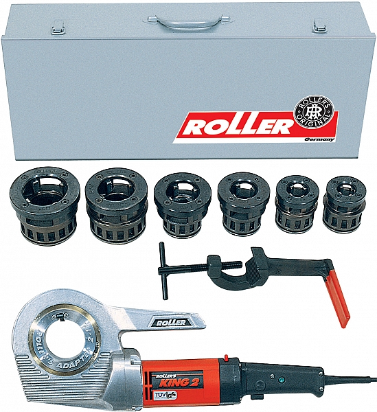 - Roller Кинг 2 Сет A/C. Привод, бугель для зажима труб, быстросменные резьбонарезные головки Рола-Автоматик R 1/2", 3/4", 1" и Централ R 1 1/4", 1 1/2", 2" в прочном стальном чемодане