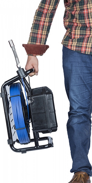 - Проталкиваемый кабель Ø 5,2 мм × 40 м из стекловолокна со встроенным счетчиком расстояния намотан на барабан из нержавейки